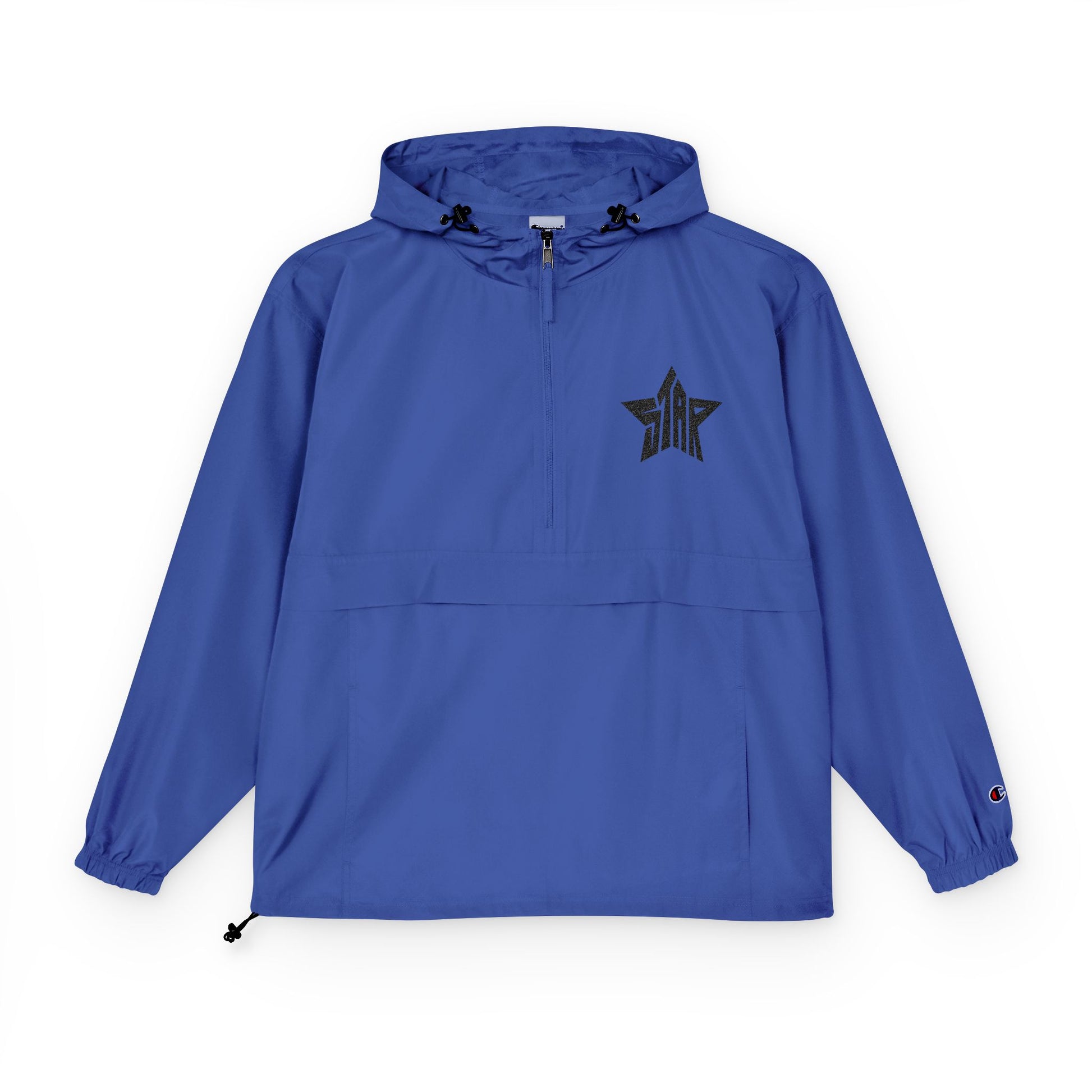 Lightweight and weather-ready, this packable anorak brings calm-blue simplicity and practical design to everyday adventures. Cut from durable polyester with a water-resistant coating, it slips on easily over layers and tucks into its hidden front pocket when you need to go hands-free. The scuba collar and hood block wind and rain, elastic cuffs seal out drafts, and the adjustable hem keeps the fit secure during gusty walks. A subtle embroidered star on the chest adds a quiet, modern accent — made for people who move between city streets and quick escapes without sacrificing style or function.