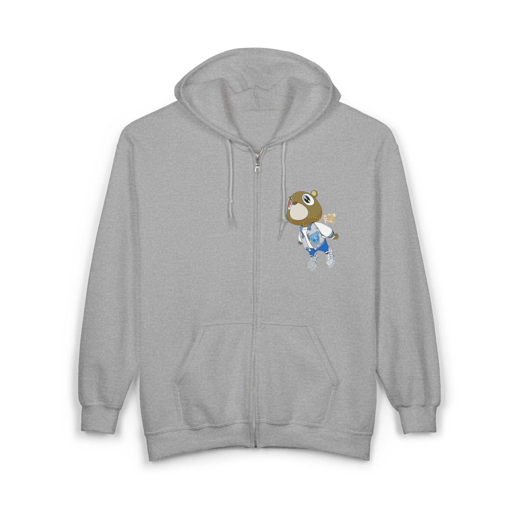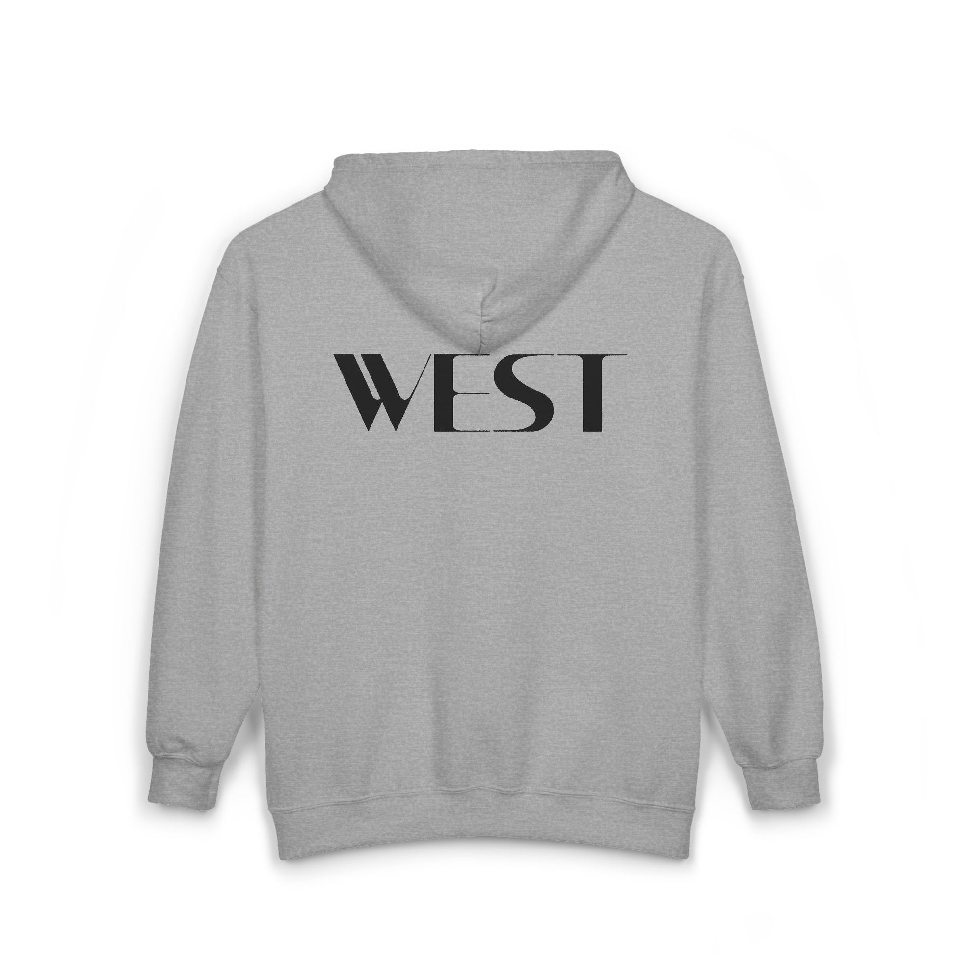 A soft, mid-weight zip hoodie that brings a quiet, playful vibe to everyday wear. The embroidered left-chest motif shows a small, whimsical character in light blues and neutrals, while the back features a subtle, tonal dotted WEST design — low-key but intentionally styled. The roomy pockets and adjustable hood make it comfortable for slow mornings, evening walks, or layering over a tee on cool days. The tubular knit body and classic fit give a clean silhouette that sits naturally whether you zip it up or leave it open. Durable metal zipper and reinforced cuffs hold up to regular wear, and the mixed cotton-poly fabric keeps it cozy without feeling heavy.
